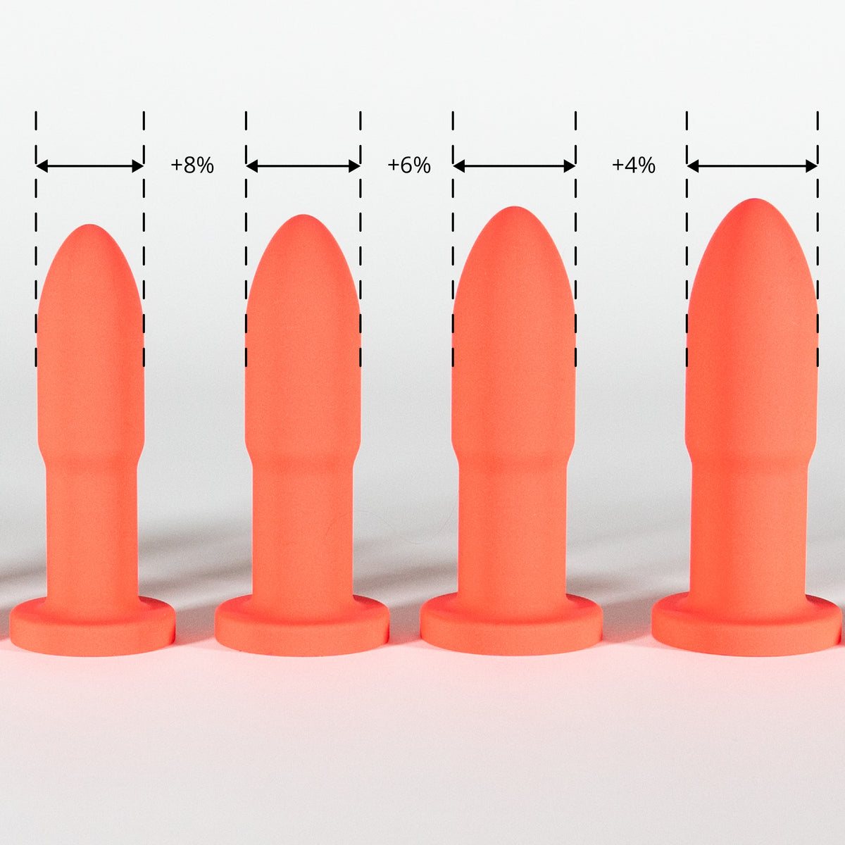 Unlike most butt plug kits, Slo.Mo’s sizing progression isn’t linear. The jump from Step 1 to Step 2 is intentionally noticeable, but from Step 6 to Step 7, the change is more subtle. That’s because even small increases feel bigger as you go up in size, so we’ve adjusted the steps to keep each stage achievable and comfortable.